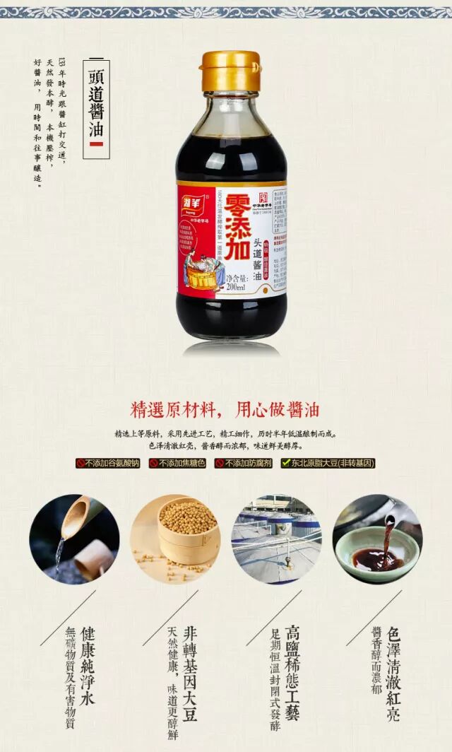 零添加頭道醬油,醬色淺紅,汁清微粘,醬香濃郁,鮮味醇厚回味持久,推薦用于清蒸海鮮、刺生類蘸食,白斬雞、白切肉蘸食,菜心、蘆筍汆水后拌食,荷包蛋蔥油面拌食等。